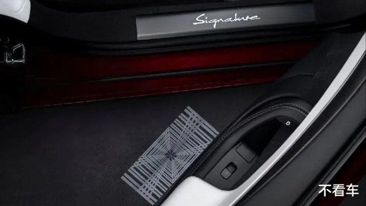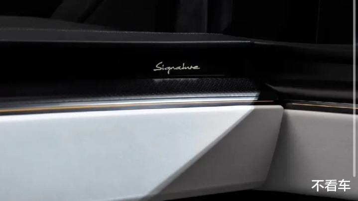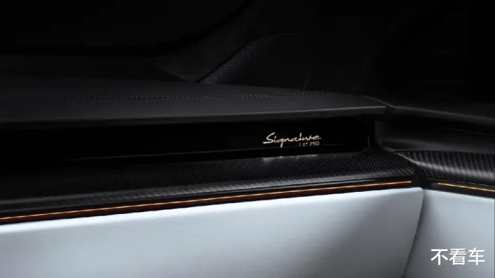 内饰为白色高级材质,带有金色Plaid座椅徽标、金色缝线、签名版门槛饰板,以及仪表板上标注限量编号的专属铭牌(如“1/250”)。此外,还包括签名版钥匙扣、金色Plaid迎宾灯、特殊内饰灯光序列以及Luxe豪华套件等细节,尽显收藏级质感。方向盘采用Yoke式设计。